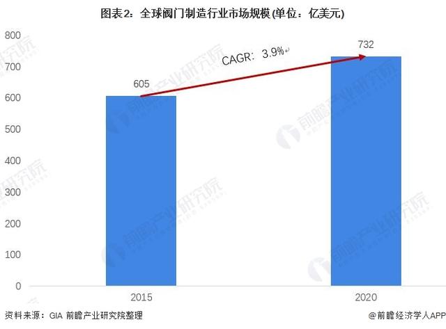 由于閥門制造行業出現較早,在世界范圍內整體市場的發展較為完備,因此近年來增速并不快,2015-2020年復合增速僅為3.9%。根據GIA的數據,2020年全球閥門制造行業的市場規模為732億美元。