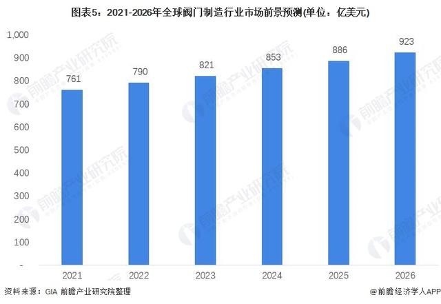 根據GIA的數據,預計在2026年,全球閥門制造行業的市場規模能夠超過900億美元,達到923億美元左右。2021-2026年,5年年復合增速為3.9%。